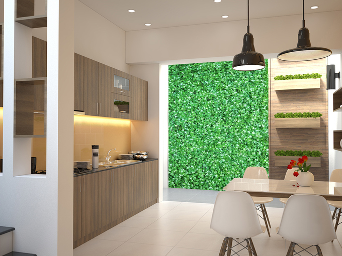 Khu vực nhà bếp bày trí đơn giản, lấy tông màu trắng làm chủ đạo rất sang trọng. Điểm nhấn ở đây chính là dùng gạch ốp tường có họa tiết hoa văn độc đáo. Hệ thống tủ bếp âm tường tiết kiệm không gian nhà bếp đáng kể.